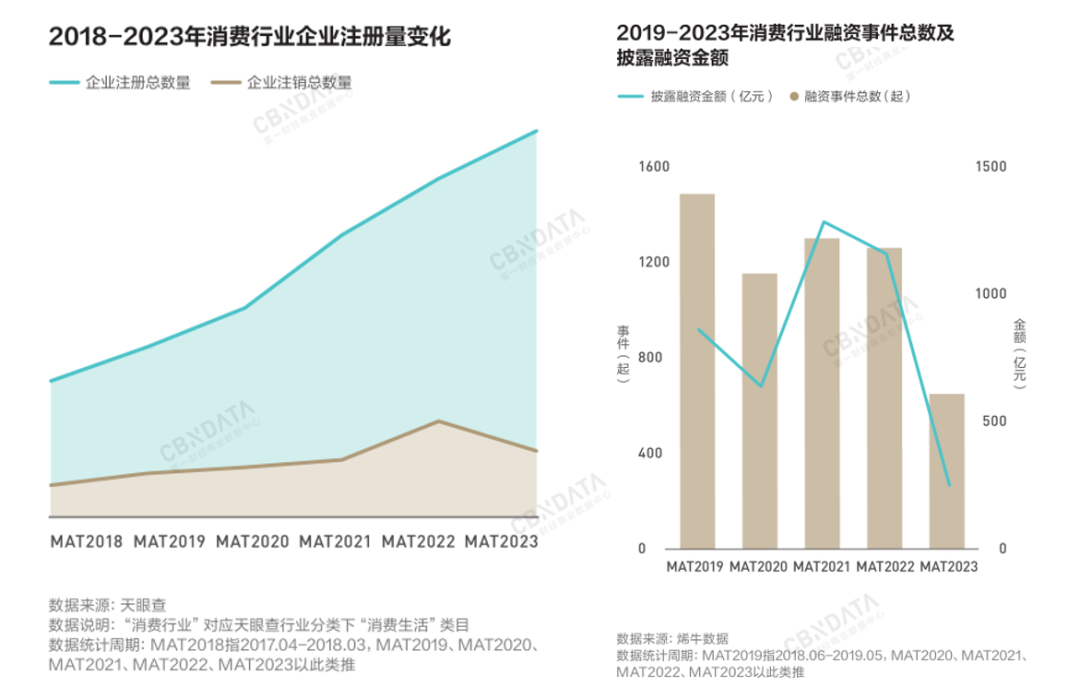 从创投市场来看,消费领域创新创业热度延续增长趋势。天眼查数据显示,消费企业注册数量连续5年保持增长态势,MAT2023周期内企业注册量超过1370万家,同比增长14.2%。