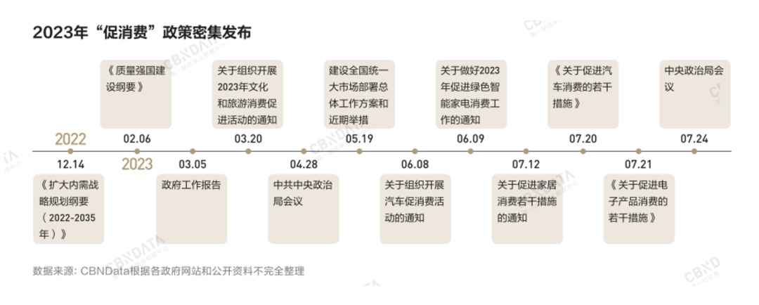 除了市场、品牌,在2023年这个消费复苏的关键之年,政策作为行业的风向标与校准器,承担着更大的期待和责任。通过梳理2022年年末至2023年年中的消费政策,CBNData发现围绕“恢复和扩大消费”这一主题,国家出台相关政策的力度在加强、速度在加快、方向更精准。随着有关外摆经济、会商文旅体融合发展、国际消费中心城市、产业带等新场景、新需求的政策相继出台,消费品牌也将迎来增长的新机遇。