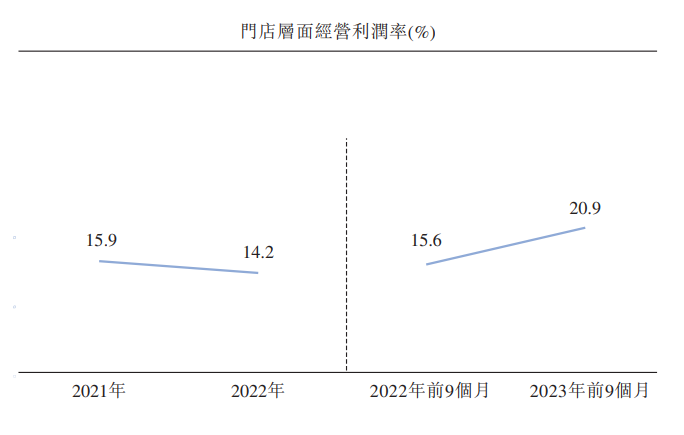 门店层面经营利润率:于2021年、2022年及截至2023年9月30日止九个月,小菜园分别录得门店层面经营利润率15.9%、14.2%及20.9%。