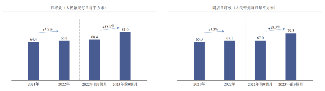 月人效由截至2022年9月30日止九个月的22,696元增长至2023年同期的26528元,增幅达到16.9%。同店月人效由截至2022年9月30日止九个月的22857元增长至2023年同期的27073元,增幅达到18.4%。