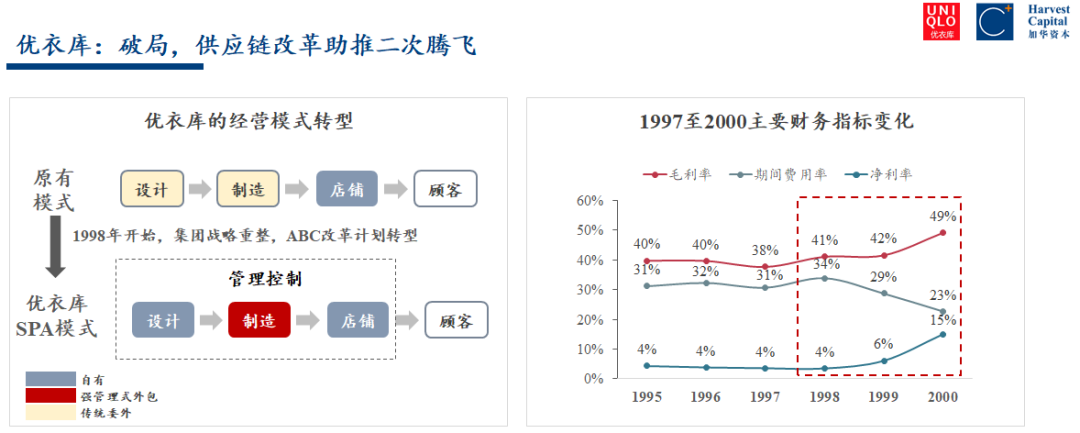 高速增长后业绩下滑,优衣库1998年开始转型为SPA模式,1999年逐渐走向正轨。优衣库在中国设置采购办事处,并安排专人在中国的工厂现场做生产和质量管理。把日本的工匠文化与中国制造融合,确保质量和价格的竞争力。