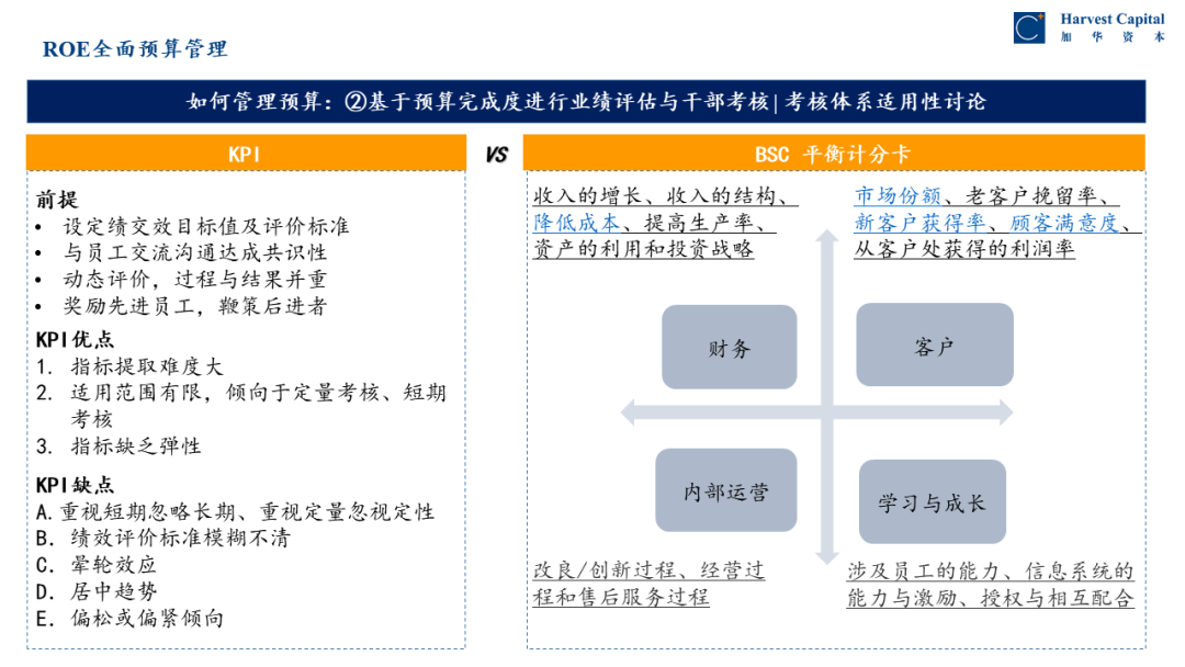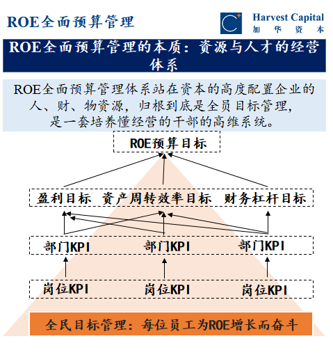 我们最后总结,怎么去结合预算,或者说预算完成度去进行干部的考核,业绩的评估。其实我们认为最终还是要回到我们一直在强调的 ROE的拆解,就是我们通过把ROE拆解成三大指标的细化的一系列的指标,然后我们把这些指标落地到每一个业务部门头上,然后保证说我们全部员工都可以为了同一个ROE 增长的目标去奋斗。