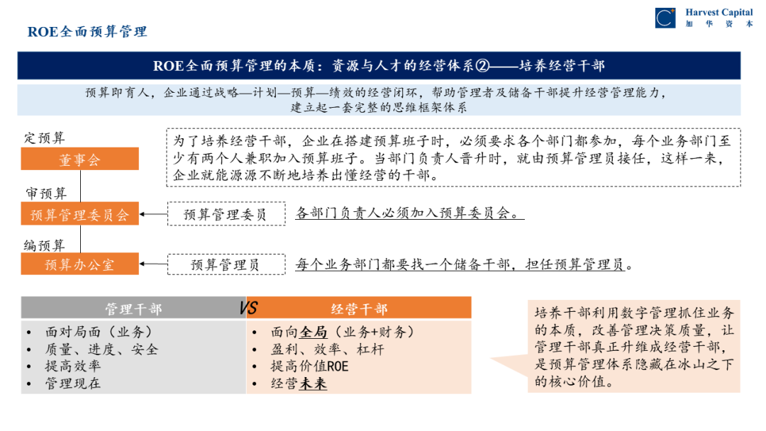 加入经营管理委员会的干部,会同时具有业务和经营视角;同时围绕ROE的三个关键指标(盈利、效率、杠杆)开展工作。培养干部利用数字管理抓住业务的本质,改善管理决策质量,让管理干部真正升维成经营干部,是预算管理体系隐藏在冰山之下的核心价值。