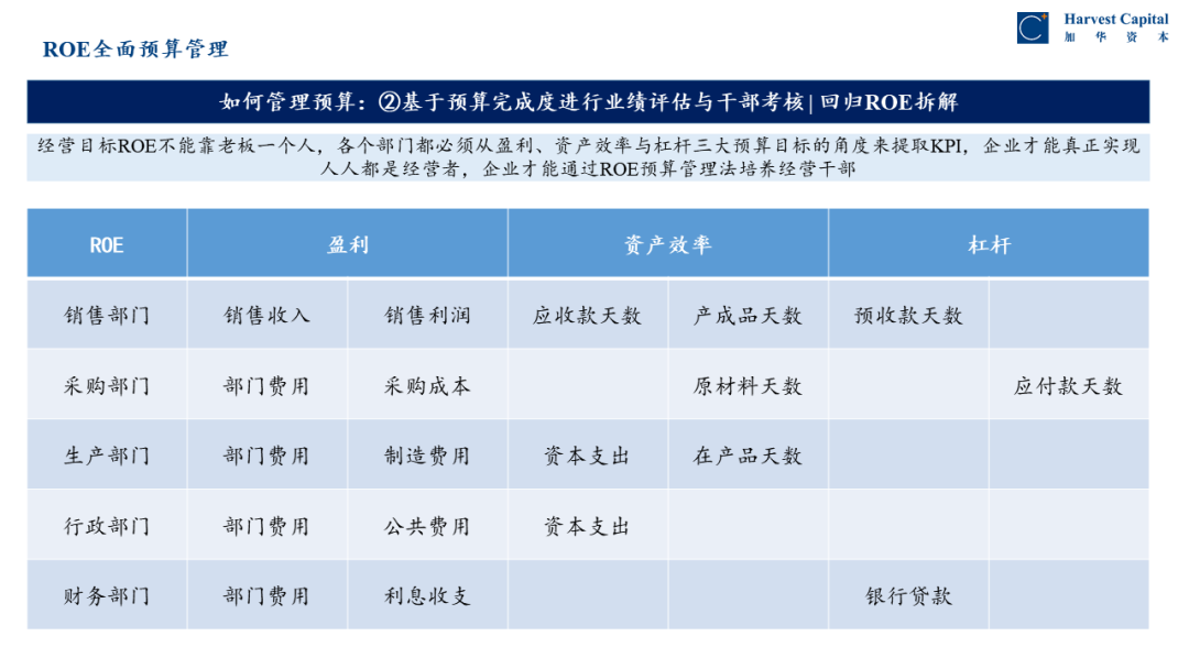 它进一步把业务目标,拆分、落地到了每一个部门的 KPI 里面,然后再通过每一个部门的 KPI 的承接,落地到了每一个岗位、每一个员工、每一天工作的 KPI 里。所以也就是通过这样一个层层的拆解,可以实现最终实现一个结果:公司的每一位员工都是为企业整体的 ROE 的增长在做奋斗。