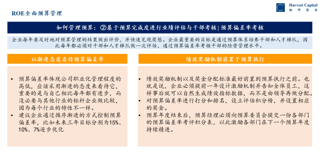 通过这些考核指标的设置,可以全方位保证ROE目标得到顺利地实现。最后每个部门实现的一个指标,跟原来我们预算的目标会产生一个偏差,那其实最后业绩考核本质上是对他们的预算的偏差率做考核。那我们这里有两个原则也是需要提醒企业去重视的。