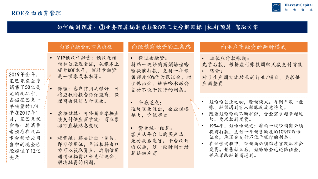 那这里其实会有几种方式,去帮助我们在不增加有息负债水平的基础上,更好地放大杠杆?向产业上下游去融资。具体可以看星巴克和娃哈哈的向客户和供应商融资的案例。