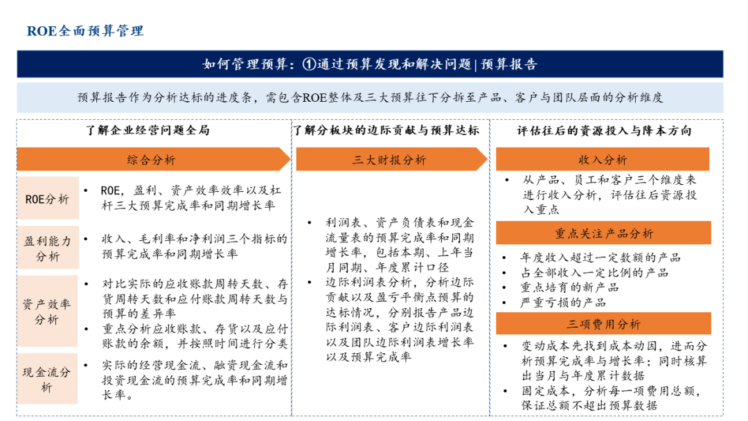 预算报告作为分析达标的进度条,需包含ROE整体及三大预算往下分拆至产品、客户与团队层面的分析维度。