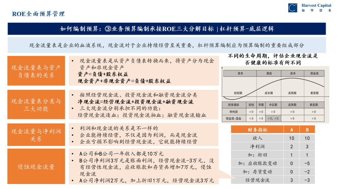 杠杆预算:底层支撑是现金流量表,包括经营现金流、投资现金流、融资现金流。需要企业具有现金思维,就是一方面充分地发挥杠杆的效益,但是又需要控制杠杆,防范你的债务风险和现金流的断裂。