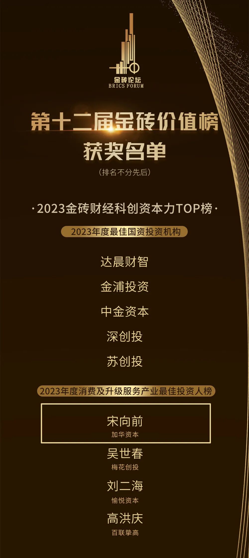 大会同时颁发了第十二届金砖价值榜。加华资本创始合伙人宋向前先生,荣登「2023年度消费及升级服务产业最佳投资人榜 」。