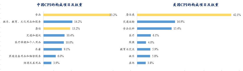 中国CPI的统计口径中,食品是第一大项目占比33.2%,而住房类则只占到13.2%,房子被认为是投资品而非消费品,因而计入住房口径的主要是房租;对比美国CPI构成,其居住类目占据了CPI构成的42.1%。