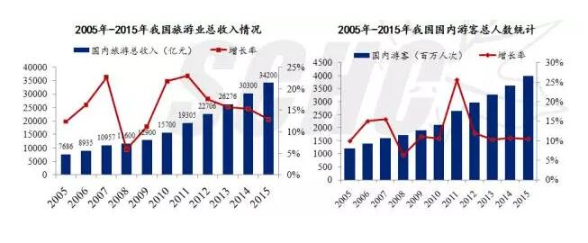 二十一世纪以来,我国旅游业在政策支持和自身发展的双重作用下步入黄金发展期。各项数据增长明显:2015年我国旅游业总收入比2005年增加了2.65万亿元,旅游总人数从2005年的8.85亿人次增长到2015年的39.90亿人次,人均旅游花费从2005年的436元增长到2015年的857元,十年间三项指标年复合增长率分别达到16.10%、16.25%和6.99%。