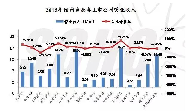 国内景区板块2015年实现总体收入124.47亿元,同比增长31.27%。其中,宋城演艺收入最高实现16.95元,同时收入同比增速高达81.21%,实现净利润6.31亿元,位居景区企业榜首。资源类景区云南旅游、张家界、黄山旅游营业收入增长率分别为52%、39%、12%,表现抢眼,其余景区较去年有所下滑。