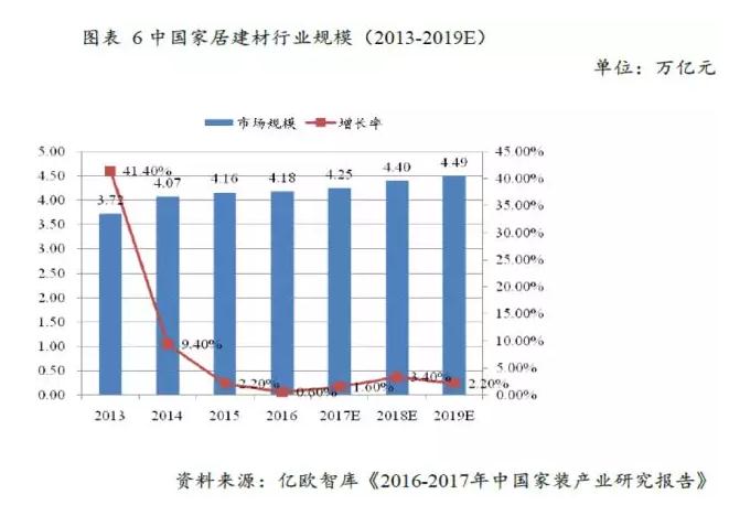 中国家居建材市场涉及硬装、软装、家纺、连锁商场、电商服务平台等多个环节,产业链条较长。在80 年代住宅商业化的推动下,公共建筑及住宅装修的兴起,刺激了改革开放前几乎为空白的建材家具行业的生产、流通和消费发展,在这样的背景下,家居建材市场规模得以持续稳定增长。根据推算,2017 年家居建材全行业的市场规模已经超过4.25 万亿。