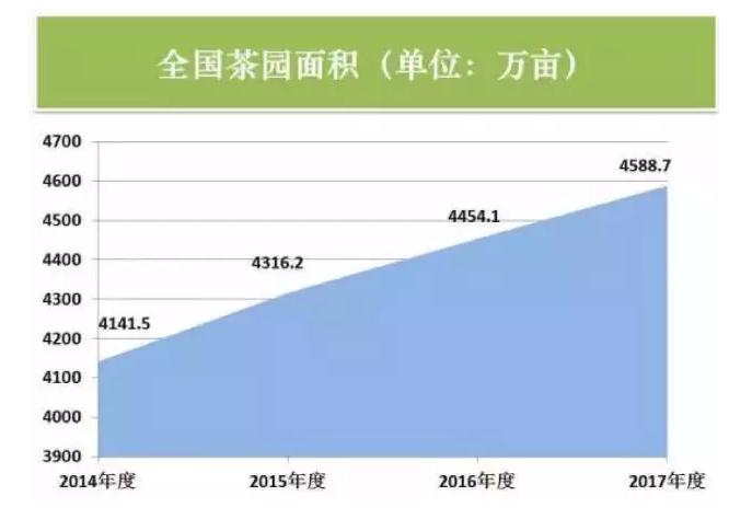 全国茶园总面积保持缓增。据调查,2017年全国18个产茶省(区)茶园面积总面积4588.7万亩,比上年增加近135万亩。