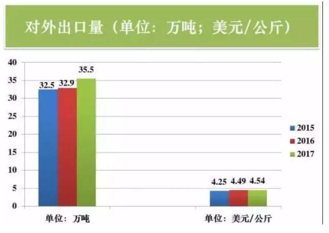出口量额持续攀升。2017年我国茶叶出口总量达35.5万吨,同比增长8.1%;出口额达16.1亿美元,比增8.7%;出口均价4.54美元/公斤,与上年基本持平。
