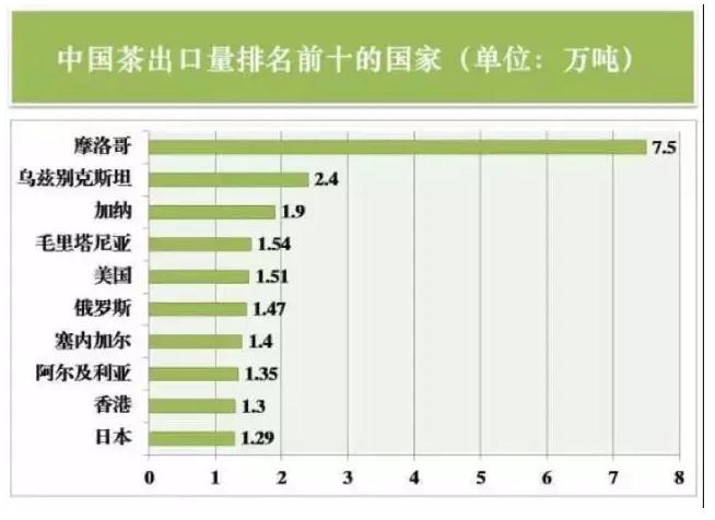 外销市场稳健提升。2017年,我国茶叶出口至128个国家和地区。茶叶出口超过万吨的国家和地区有12个,占全年出口总量的64.8%。