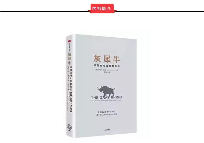 类似以黑天鹅比喻小概率而又影响巨大的事件,本书以灰犀牛比喻大概率且影响巨大的潜在危机。相对于黑天鹅事件的难以预见性和偶发性,灰犀牛事件不是随机突发事件,而是在一系列警示信号和迹象之后出现的大概率事件。例如:2008年美国房地产泡沫集中爆发以及在此之前的诸多泡沫破裂;飓风卡特里娜和桑迪以及其他自然灾害后的毁灭性余波;颠覆了传统媒体的现实数码技术;大桥坍塌和摇摇欲坠的城市基础设施;苏联的迅速衰败和中东地区的混乱,在事前均出现过明显的迹象。