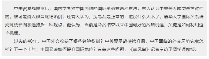 阎学通:改革开放40年以来,中国最大的经验是,只有不断扩大开放才能增强实力、提高国际地位。当前最紧迫的是扩大开放的原则要落地为具体的政策,每个领域要更开放,而不是更严控。