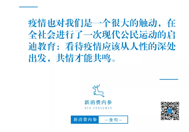 疫情也对我们是一个很大的触动,在全社会进行了一次现代公民运动的启迪教育:看待疫情应该从人性的深处出发,共情才能共鸣。