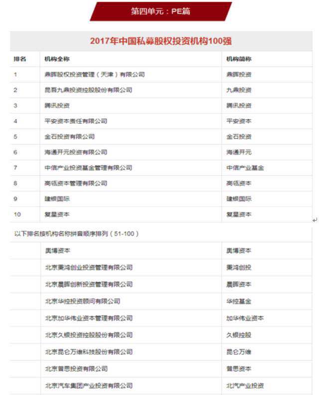 在榜单中最重磅的第四单元“PE篇”,鼎晖投资、腾讯投资、平安资本、加华伟业资本等100家在综合或细分投资领域处于行业第一梯队的股权投资机构荣登了“2017中国私募股权机构100强”。