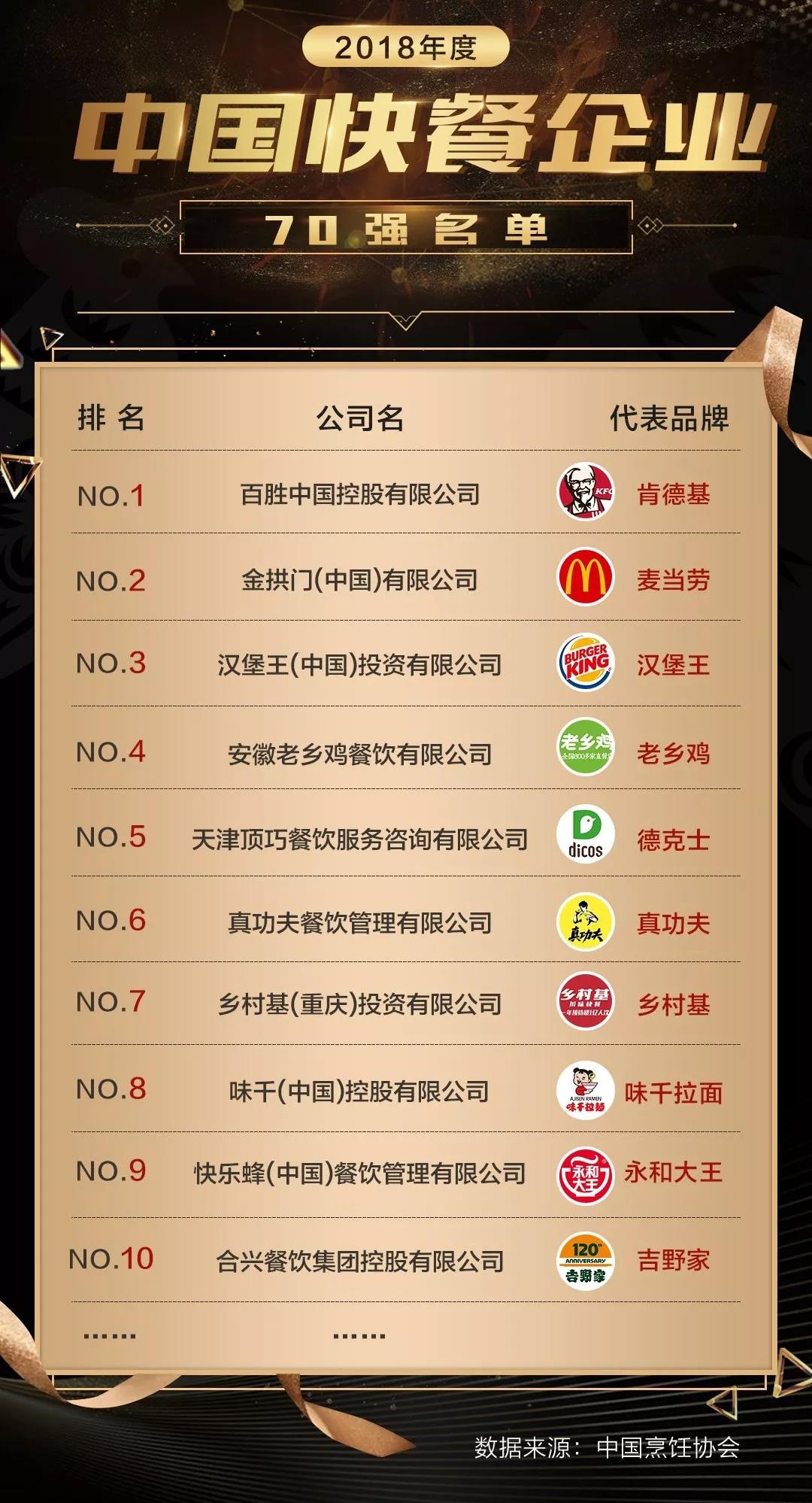 10月11日,由中国烹饪协会主办的“2019第23届中国快餐产业大会暨‘中国快餐品类及代表品牌’发布会”在大连隆重召开。会上,中国烹饪协会发布了“2018年度中国快餐70强”榜单。