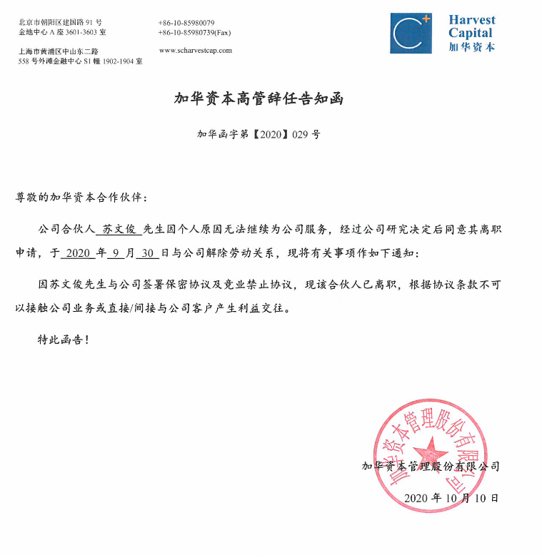 加华资本高管辞任告知函