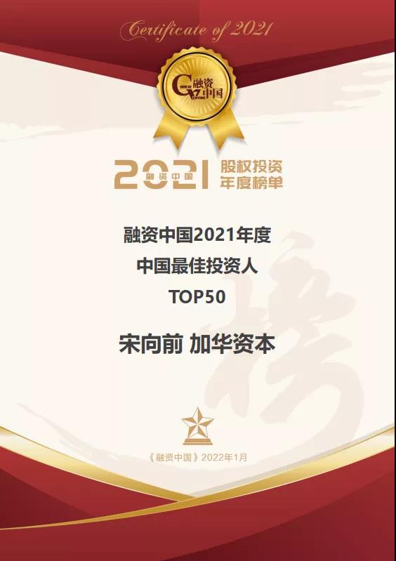加华资本创始合伙人、董事长宋向前先生荣获“2021年度中国最佳投资人TOP50”