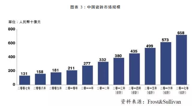在住宅市场增长的推动下,中国瓷砖市场规模由二零零七年的人民币1,310亿元增至二零一二年的人民币3,320亿元,复合年增长率为20.5%,预期至二零一七年将进一步增至人民币6,580亿元,二零一三年至二零一七年的复合年增长率将为14.8%。预计此后中国的瓷砖市场将保持增长态势。