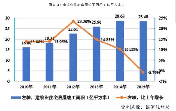 2010-2015年,在国内经济快速发展、城镇化不断加速、保障房建设取得较大成绩等因素的推动下,国内住宅房屋的建设规模较大,建筑业住宅房屋竣工面积快速增长,从16.06亿平方米增长到28.40亿平方米。