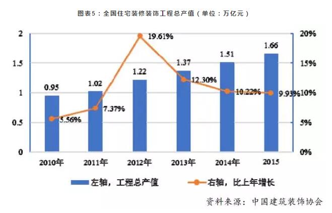 同期,国内住宅装修装饰保持同步的发展速度,全国住宅装修装饰的工程总产值从2010年的0.95万亿元增长到2015年的1.66万亿元。建筑陶瓷产品在住宅中用于外墙面、厨卫空间、阳台、地面的装修装饰,住宅装修装饰的发展推动建筑陶瓷产品的市场规模平稳增长。