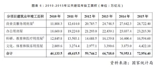 2010-2015年,在国内经济快速发展和各级政府的推动下,国内营业性、事业性和机关单位的公共建筑兴建较多,年竣工面积快速增长。