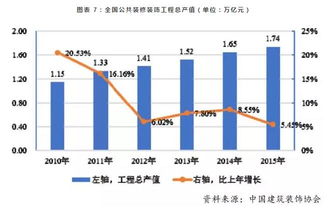 在这一趋势的推动下,国内公共建筑装修装饰取得了较大发展。全国公共建筑装修装饰的工程总产值从2010年的1.15万亿元增长到2015年的1.74万亿元。