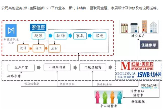 从2012年开始,红星美凯龙为提升消费者一站式购物体验,引入了软装馆、家装设计及装修服务,推出O2O平台、互联网家装、消费金融等拓展性业务,强化消费者的线上线下一体化体验;公司也大力开展供应链相关产品与服务,在物流配送方面,向家居商场商户提供标准化的专业物流配送服务,减少商户经营成本,建立更为紧密的合作关系;在统一采购方面,开展集采平台。