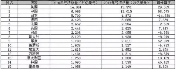 我们再来看看绝对实力的变化,也就是2017年的经济总量比2010年增加了多少:中国绝对经济实力增加最多为5.949万亿美元,占全球42.63%;第二是美国,增加4.427万亿美元,占全球31.72%;第三印度,增加0.903万亿美元,占全球6.47%;第四韩国,增加0.443万亿美元,占全球3.17%;第五德国,增加0.262万亿美元,占全球1.88%;第六英国,增加0.181万亿美元,占全球1.3%。