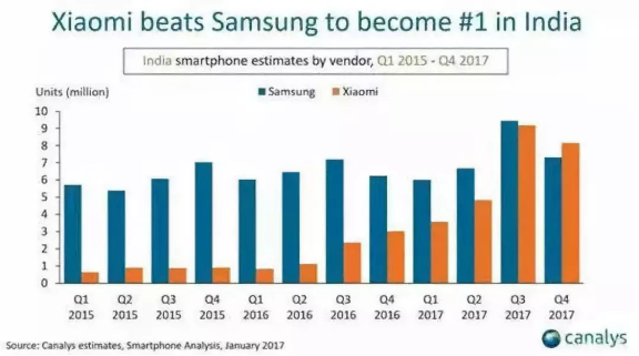目前来看,小米在和三星的对决中在不断占据优势,根据Canalys的数据,小米科技在 2017 年第四季度首次超越三星,在印度智能手机市场占比第一,印度的《经济时报》甚至还在头版使用了“第一”两个汉字来报道小米在印度的崛起。