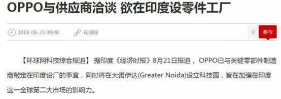 不仅如此,根据2018年8月21日印度《经济时报》的消息,OPPO已经完成与国内主要手机零部件供应商的谈判,将在2019年在印度建立手机零部件工厂,同样建在大诺伊达工业区。