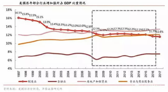 美国人在过去的八年,制造业增加值占GDP的比例继续下滑,但是总体幅度不大。2010年为12.2%,之后保持稳定了四五年,但从2015年~2017年,从12.1%下滑到了11.6%,特朗普想搞制造业回流,其背后的原因还是美国本土的制造业占GDP比例在过去的20年呈现一直下滑的趋势。
