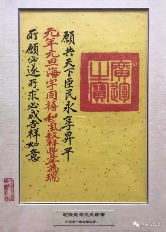 在第一历史档案馆中,还珍藏着另外一件文物,是乾隆皇帝登基那年的元旦开笔,在洒金宣纸上手书了昭告天下的祝福,上面的文字是:“元年元旦海宇同禧和气致祥丰年为瑞”,并且“愿共天下臣民永享升平”、“所愿必遂所求必成吉祥如意”。此时的乾隆皇帝,志满意得。他有足够的理由,因为此时的中国,经济总量占到全球的三分之一,而且还是全世界最有秩序的国家,所谓礼仪天下。这一年,是1736年,离宣告清王朝走向崩溃的第一次鸦片战争,相距大致正好100年。