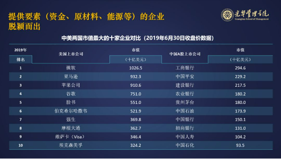 这一特色也反映在中国经济的微观基础——企业上。以信贷来驱动的投资迅速改变了中国经济的微观基础,我们现代意义上的企业实现“从无到有”,“从小到大”,实现了中国企业在规模上的崛起。2019年是一个具有标志意义的年份,《财富》7月份公布的全球销售收入最高的500家企业中,中国大陆、香港和台湾地区共有129家企业入榜,数量超过了美国的121家。这背后反映了中国企业在规模上的崛起,这也与我上面提到的社会信用扩张、信贷驱动的投资拉动的经济增长模式紧密相关。从上市公司来看,我们A股市场前10大市值公司,与美国前十大上市公司相比,结构上有很多差异。A股前10大市值企业基本上都是提供生产要素的,要么提供资金,要么提供能源。唯一一个例外就是茅台,但是茅台本身在中国的商业文化里似乎也可被视为生产要素。
