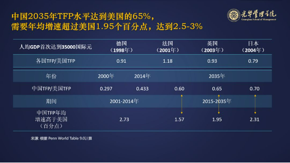 经过改革开放40年的高速增长,中国的全要素生产率水平相当于美国的43%左右,这已经非常了不起。但是,我们(光华思想力课题组)测算,到2035年中国基本实现社会主义现代化时,中国的TFP水平即使只是达到美国的65%,也需要我们的全要素生产率的年均增速超过美国1.95个百分点,即,未来十六年需要保持每年2.5%-3%的增速水平。在人类历史有统计数据以来,还没有任何一个国家在完成了工业化进程之后,还能保持3%左右的全要素生产率增速,美国、日本都没有做到。中国有没有可能再创造一个奇迹?这是我们在理解中国经济的未来时,需要去直面的、最重要的第一性的问题。对这个问题的理解本身,基本上决定了我们对中国经济未来的判断。