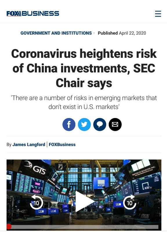 美国证监会4月21日发表主席Jay Clayton及美国公众公司会计监督委员会(PCAOB)主席William Duhnke等五位官员的声明,提醒美国境内投资者在投资总部位于新兴市场或在新兴市场有重大业务的公司时,注意财务报告及信息披露质量的风险。
