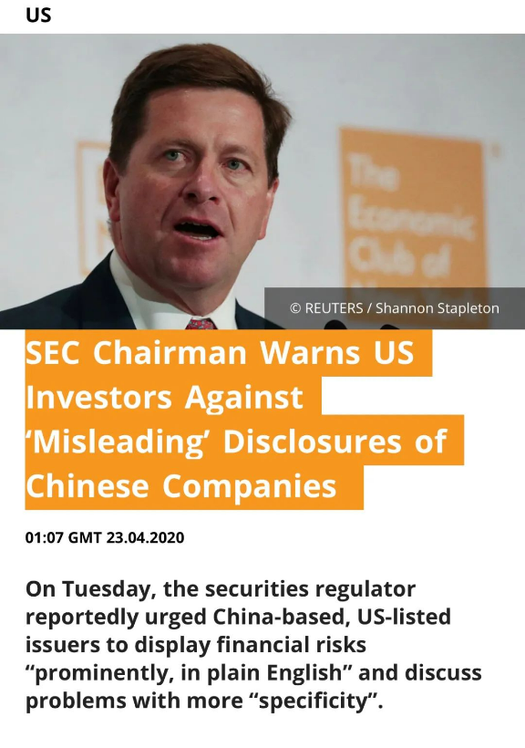 财联社4月23日讯,美国证券交易委员会主席杰伊•克莱顿(Jay Clayton)北京时间4月23日发布言论称,因为信息披露的问题,他提醒投资者近期在调整仓位时,不要将资金投入在美国上市的中国公司股票。