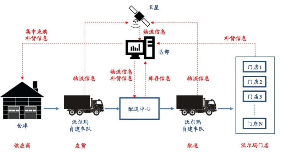 供应商发货给沃尔玛的自建车队运输至配送中心,同时“物流信息”随时上传至沃尔玛的私人卫星,并反馈给总部和配送中心;
