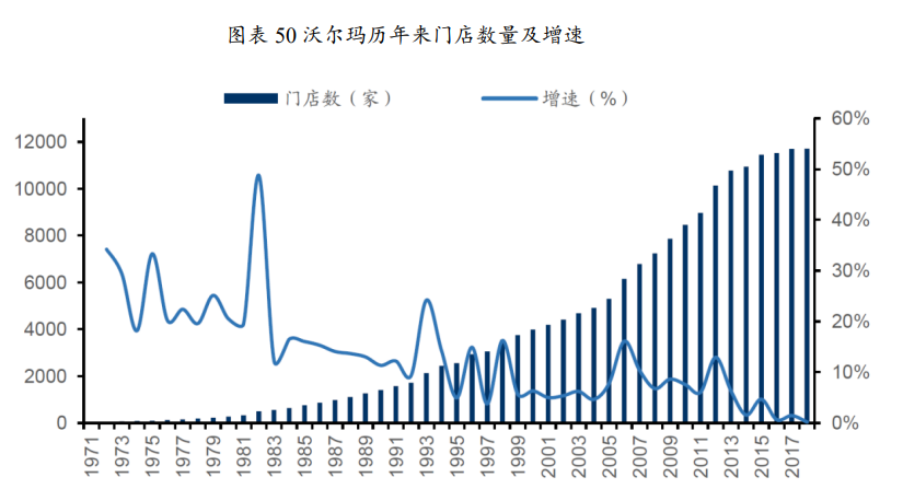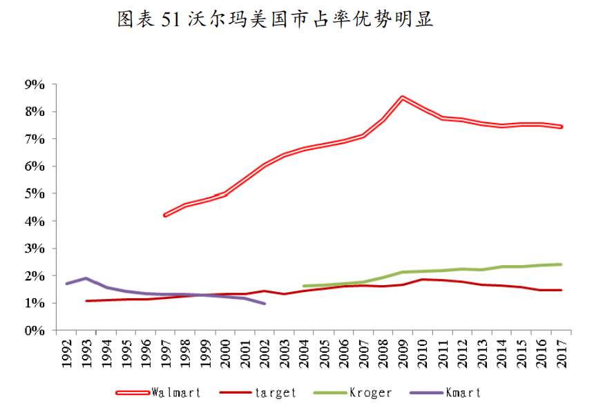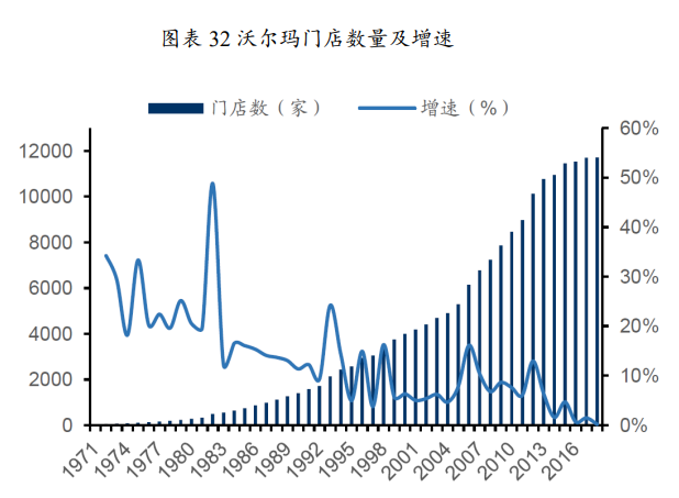 80年代经济持续高速增长,优化店型满足更广阔消费者的购物需求:整个80年代美国经济保持高速增长,沃尔玛的折扣店及会员店之和达到1364家,已经具备向大城市扩张的能力。沃尔玛第一家购物广场于1988年设立,主要针对低收入家庭消费者,竞争对手是独立百货和其他大型连锁超市,创立理念是节省时间和开支,追求“一站式”购物体验,齐全的种类满足消费者一次性购买全部商品的需求。沃尔玛购物中心一般分布在城乡结合区域,以较低的租金获得巨大的使用面积。值得注意的是,1991年沃尔玛国际化扩张的同时并没有减缓国内扩张和区域加密的节奏,相对于折扣店增速在1990年到顶(172家/年)、1998年后持续减少,会员店每年开店数量稳定在5-20家,沃尔玛后期开店的主力为购物广场,到2006年的高峰时期每年新增260家,而到2017年净开店39家,一直没有负增长。折扣店业态逐渐弱化,会员店目标客群较窄,而面积巨大、单位成本较低、引入少量体验业态的购物广场在品类、价格和体验方面均可以满足更加广泛消费群体的需求,在地广人稀的美国是扩张的最优模型。
