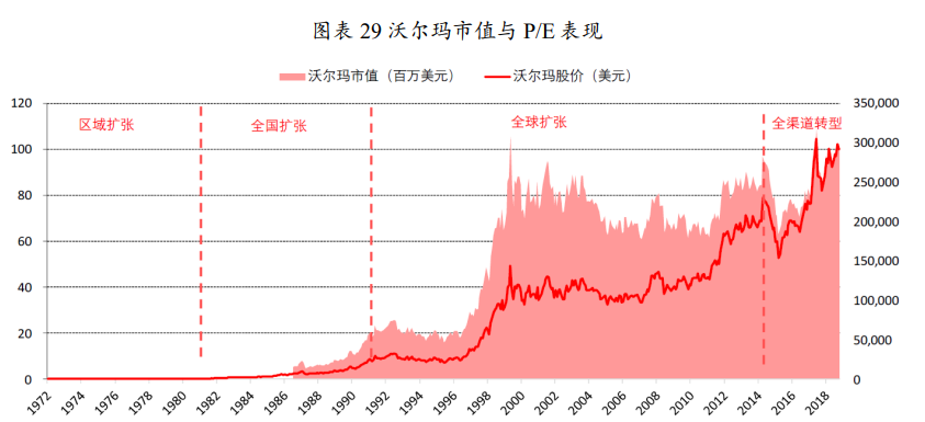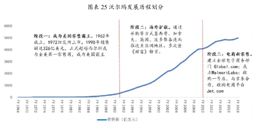 复盘沃尔玛发展的全过程,以公司成立、成为全美第一大零售公司、发展电商新零售作为时间节点,将沃尔玛的发展历程划分为三个阶段: