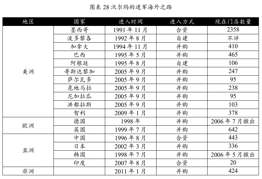 1996年由中国进入亚洲市场。1996年,沃尔玛以购物广场和会员店的形式进入深圳,1998年通过收购方式进入韩国市场,2002年并购西友百货进入日本,2007年通过与当地公司合资开始在印度经营批发业务。1998年以德国为突破口进入欧洲市场。1998年公司收购德国维特考夫21家门店,第二年收购施帕尔80家商铺,1999年公司收购与自身非常相似的英国超市公司Asda,后者在2003年成为英国第二大零售集团,2002年沃尔玛收购英国市占率第四的Safeway,再次取得了10%的市场份额。