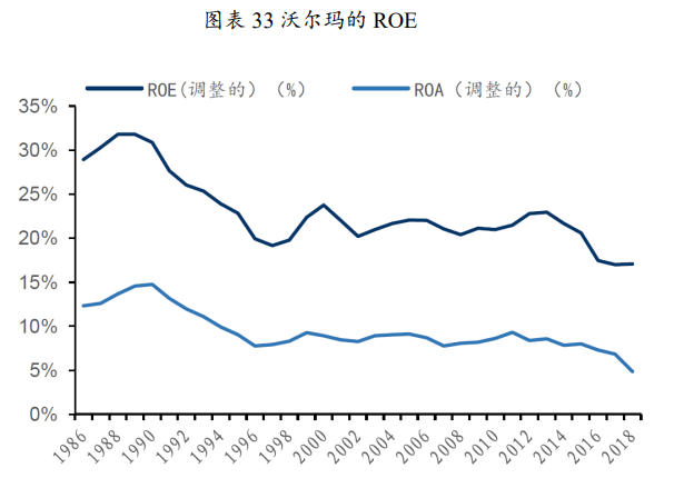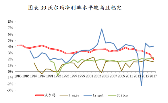 净利率:自1986财年以来,沃尔玛净利率基本保持在3%,与同业相比处于较高水平,且净利率的稳定性最强。但2017财年以后,因电商投入加大,使得净利率有所下滑,2019财年净利率下滑至1.30%。