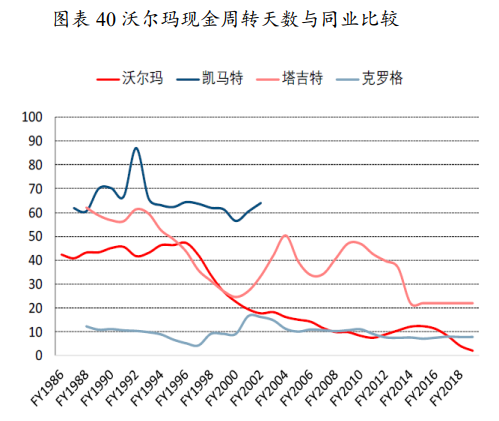 90年代后期,正是沃尔玛将大量最新科技应用的密集阶段,存货管控水平大幅提升,存货周转天数从FY1997的70天降至FY2005的47天。应付账款周转天数从FY1997的31天逐渐提升至FY2005的34天,表明对上游议价能力不断增强。与同业相比,FY2005年之前,克罗格现金周转天数处于行业绝对领先地位,沃尔玛处于行业中等水平,之后沃尔玛现金周转天数大幅下降并超越克罗格,FY2019仅为2天,为可比公司中最低水平。