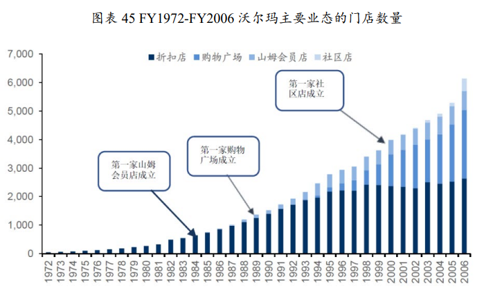 沃尔玛全国扩张过程中公司并没有固守折扣店业态单一发展,而是紧盯国内经济发展形势和消费者需求变化而孵化更多业态。1983年设立山姆会员店、1988年设立购物广场、1998年开创社区店,每一步都是对零售市场理解的深化。