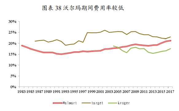 总体来说,沃尔玛的人效处于行业领先水平,人均销售额由1986年的8.4万美元提升至2017年的27.15万美元,长期高于塔吉特和凯马特;32年的平均人效为16万美元,较塔吉特和凯马特高出1.29万美元和5.13万美元,较高的人均销售额和稳定的人均薪酬带来较对手更低的人工费率。